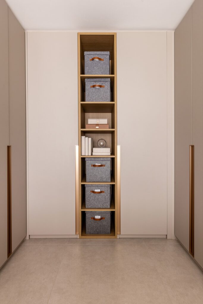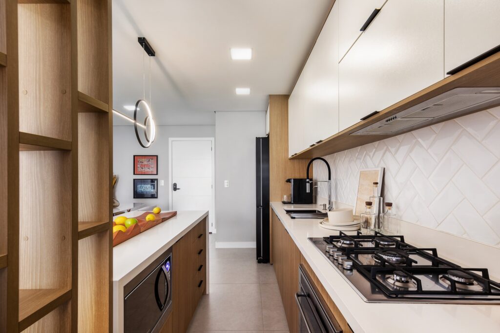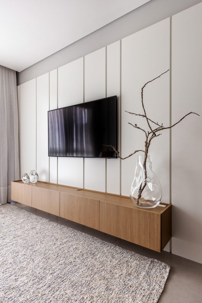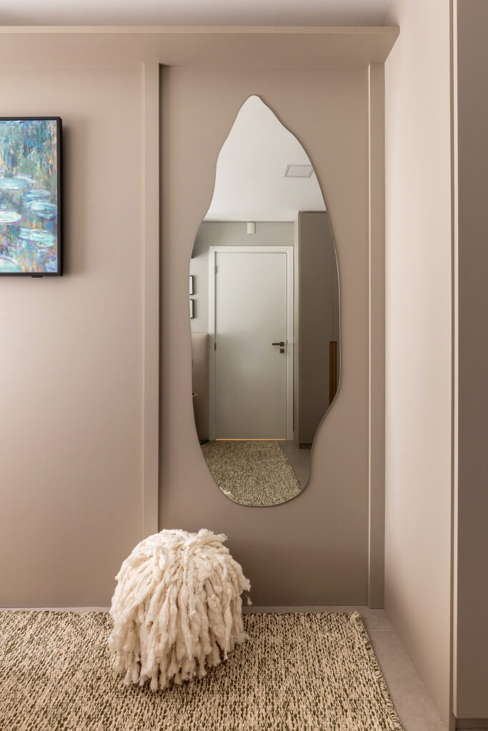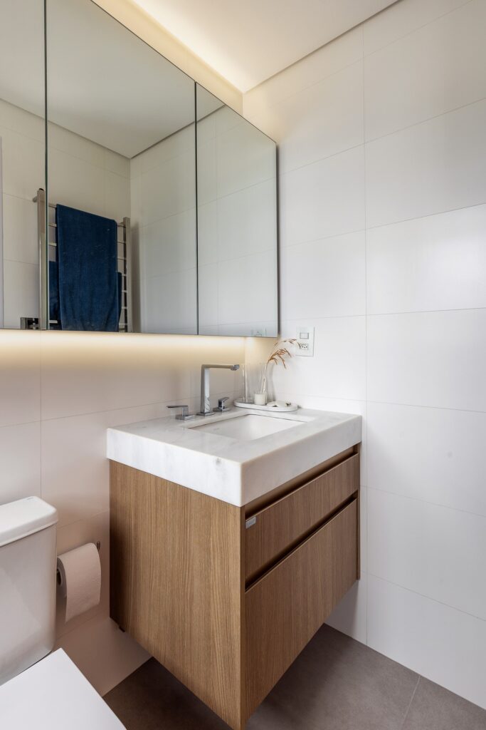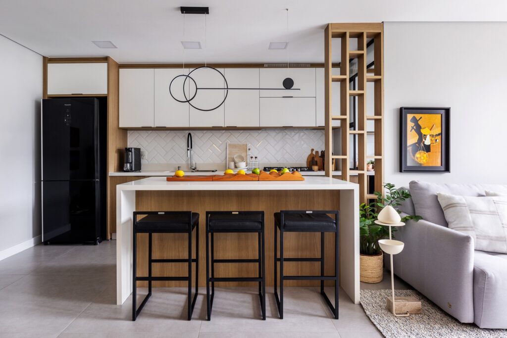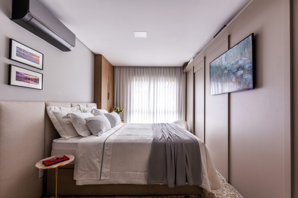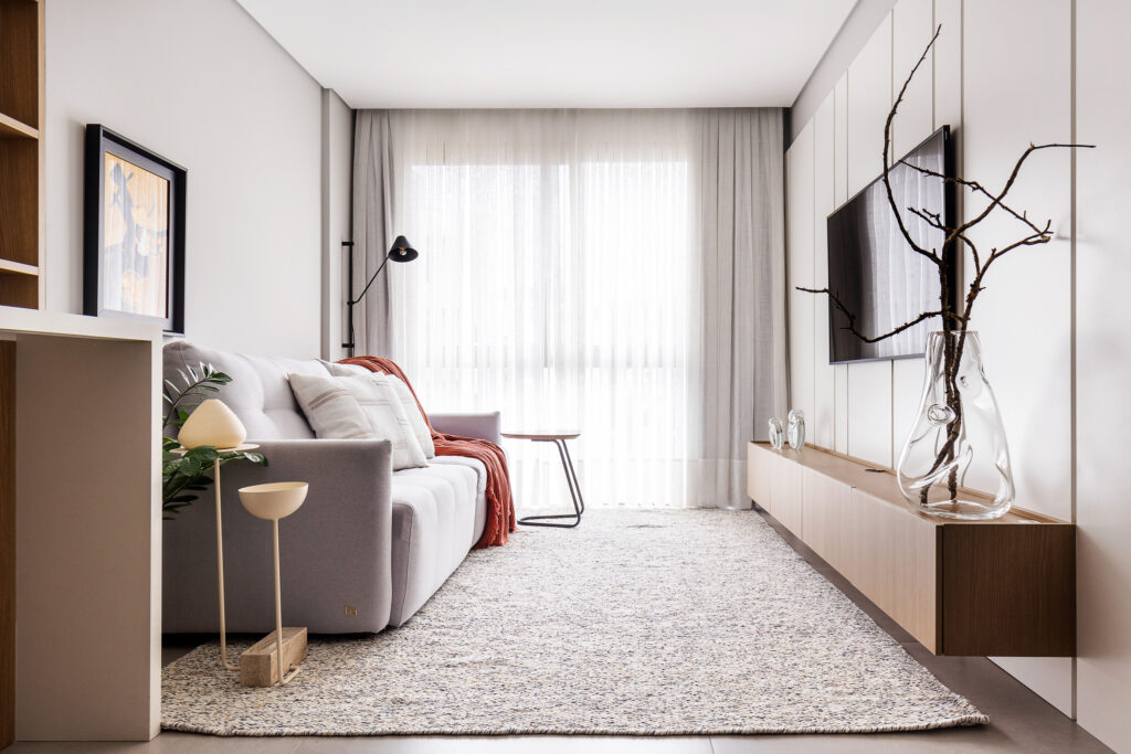 O Ap Sambatti nasceu da história e das memórias de sua moradora, que buscava um refúgio de descanso e acolhimento. A paleta neutra em branco, cinza e madeira cria uma base serena, enquanto o quarto ganha calor com tons de bege e madeira, reforçando a atmosfera tranquila. A cozinha foi pensada como o coração da casa: a ilha em quartzo branco amplia a bancada de preparo e também se conecta à sala de estar, integrando os ambientes com praticidade e elegância. Já a sala segue a mesma linha clean e funcional, garantindo amplitude, iluminação e conforto.