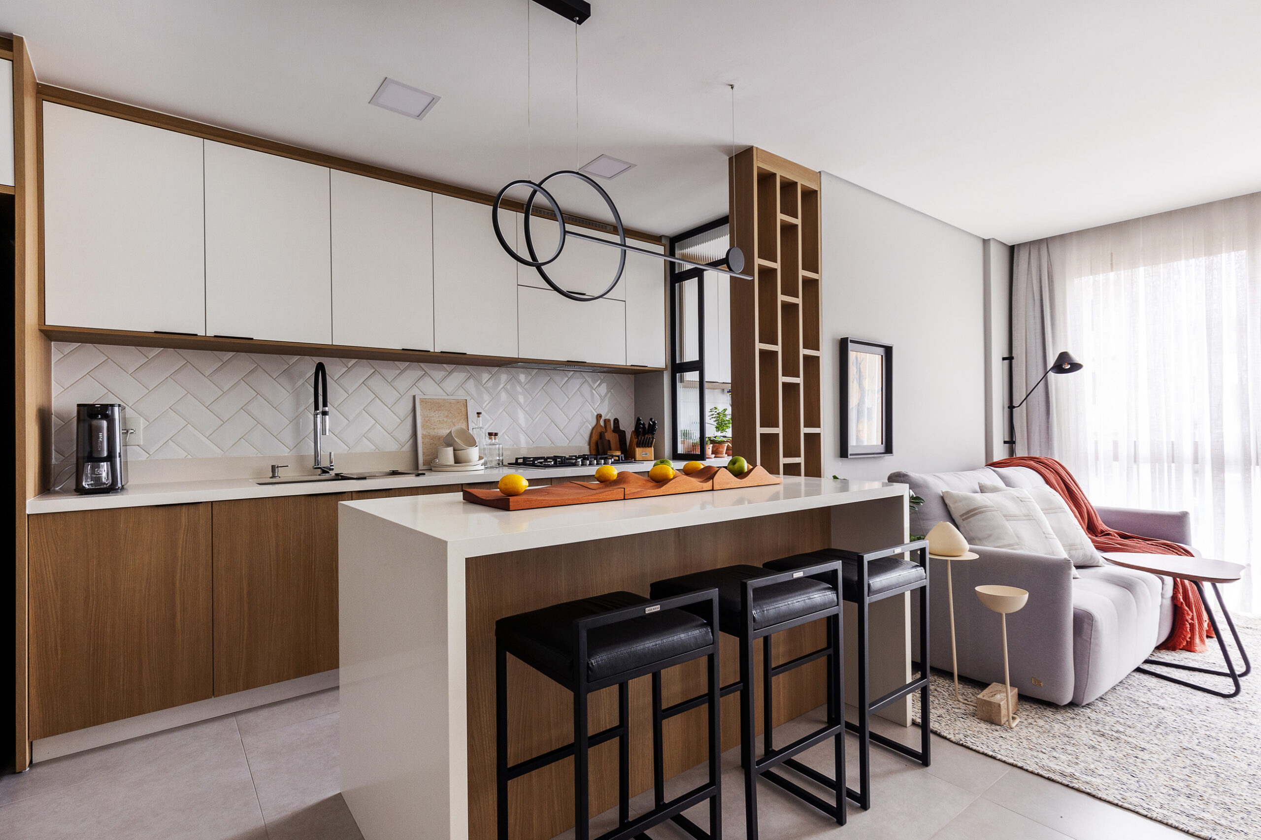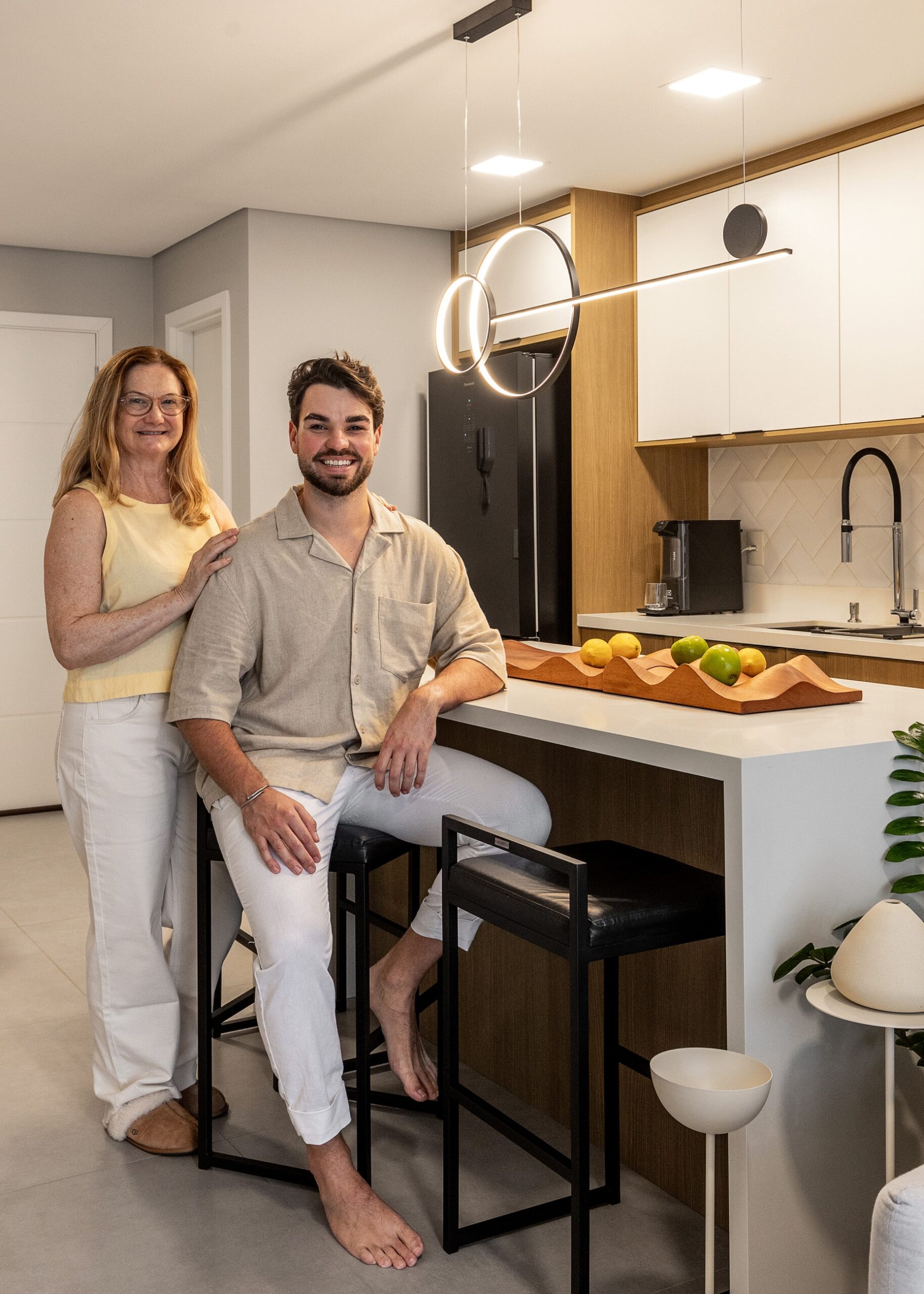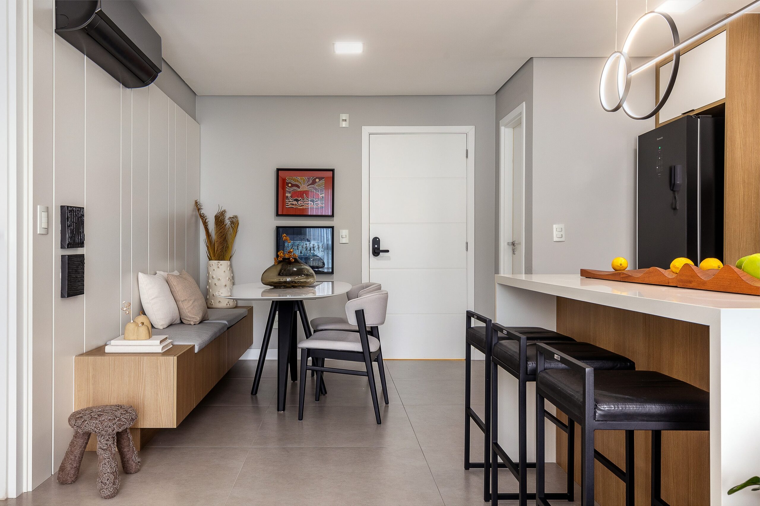 O Ap Sambatti nasceu da história e das memórias de sua moradora, que buscava um refúgio de descanso e acolhimento. A paleta neutra em branco, cinza e madeira cria uma base serena, enquanto o quarto ganha calor com tons de bege e madeira, reforçando a atmosfera tranquila. A cozinha foi pensada como o coração da casa: a ilha em quartzo branco amplia a bancada de preparo e também se conecta à sala de estar, integrando os ambientes com praticidade e elegância. Já a sala segue a mesma linha clean e funcional, garantindo amplitude, iluminação e conforto.
