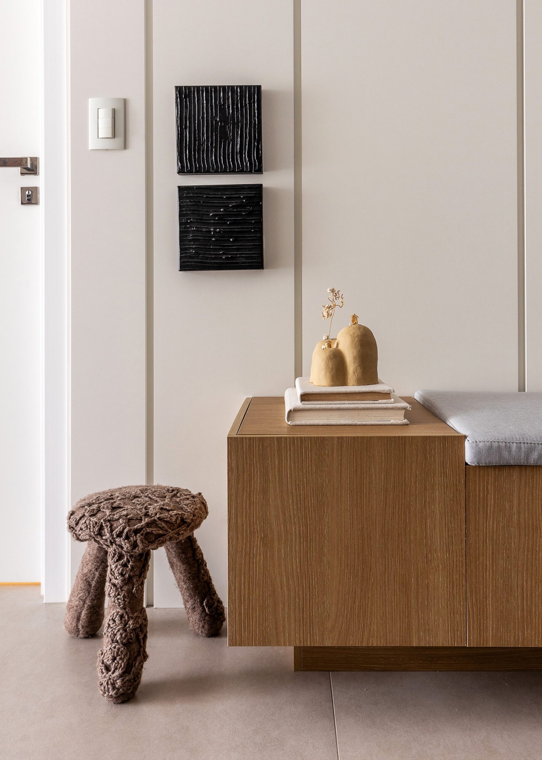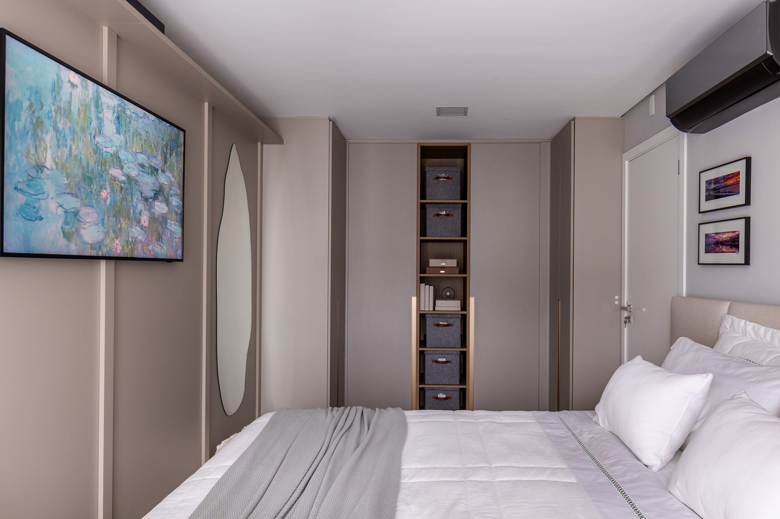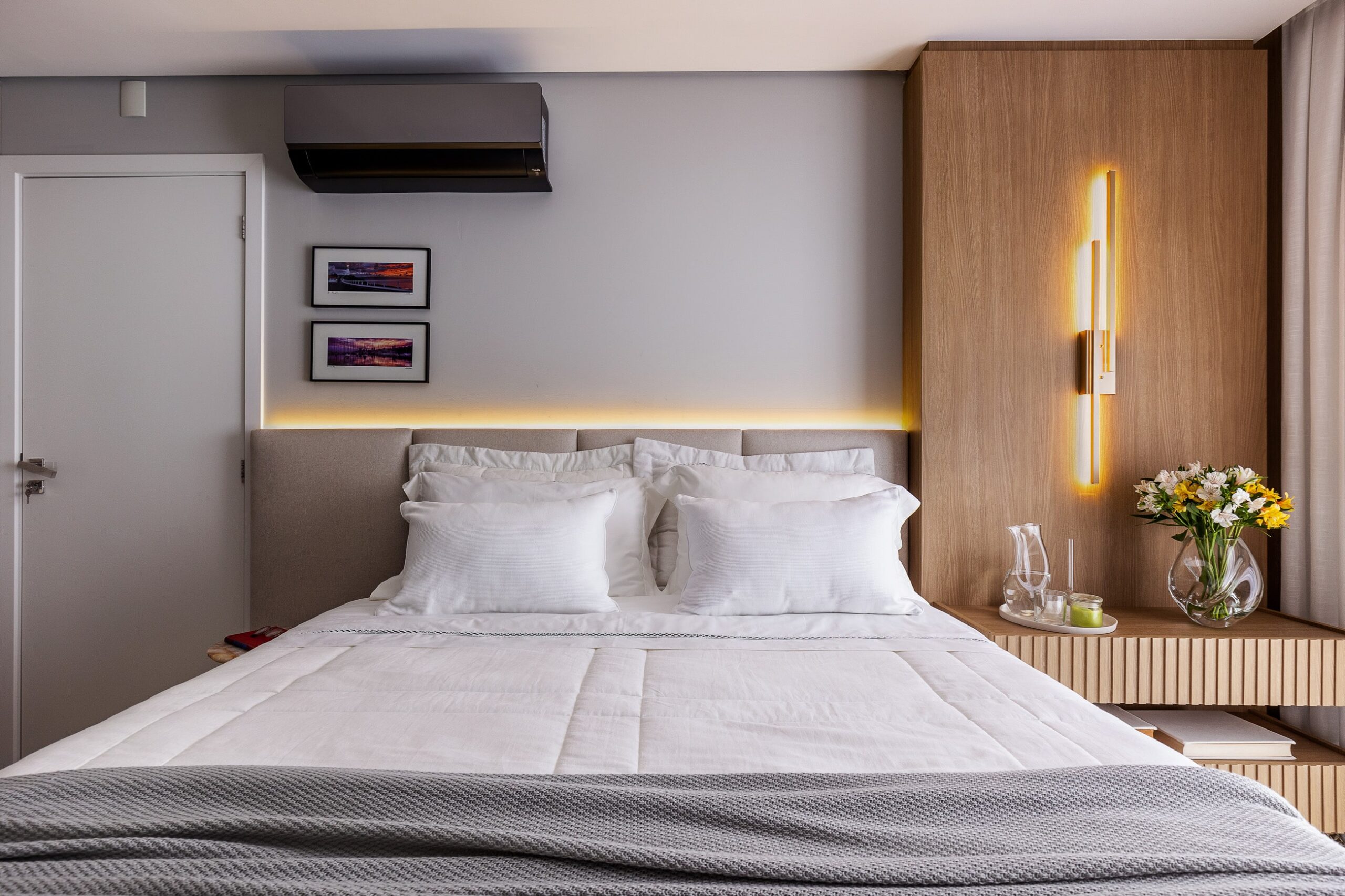 O Ap Sambatti nasceu da história e das memórias de sua moradora, que buscava um refúgio de descanso e acolhimento. A paleta neutra em branco, cinza e madeira cria uma base serena, enquanto o quarto ganha calor com tons de bege e madeira, reforçando a atmosfera tranquila. A cozinha foi pensada como o coração da casa: a ilha em quartzo branco amplia a bancada de preparo e também se conecta à sala de estar, integrando os ambientes com praticidade e elegância. Já a sala segue a mesma linha clean e funcional, garantindo amplitude, iluminação e conforto.